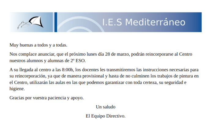 El alumnado de 2º ESO vuelve de forma presencial el próximo lunes día 28 de marzo. A continuación se adjunta un documento donde se detalla el proceso.