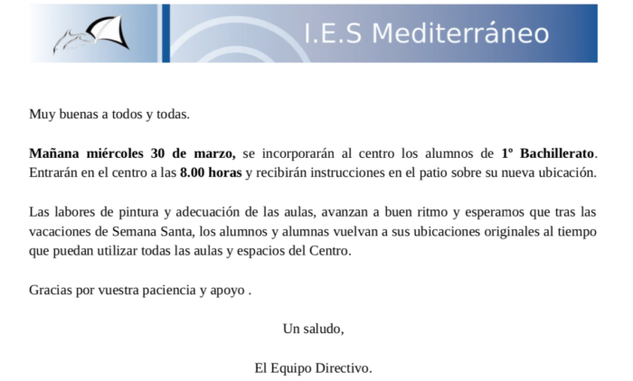 El alumnado de 1º de Bachillerato volverá mañana al centro para dar retomar las clases presenciales. A continuación se adjunta un documento para dar los detalles de la vuelta.