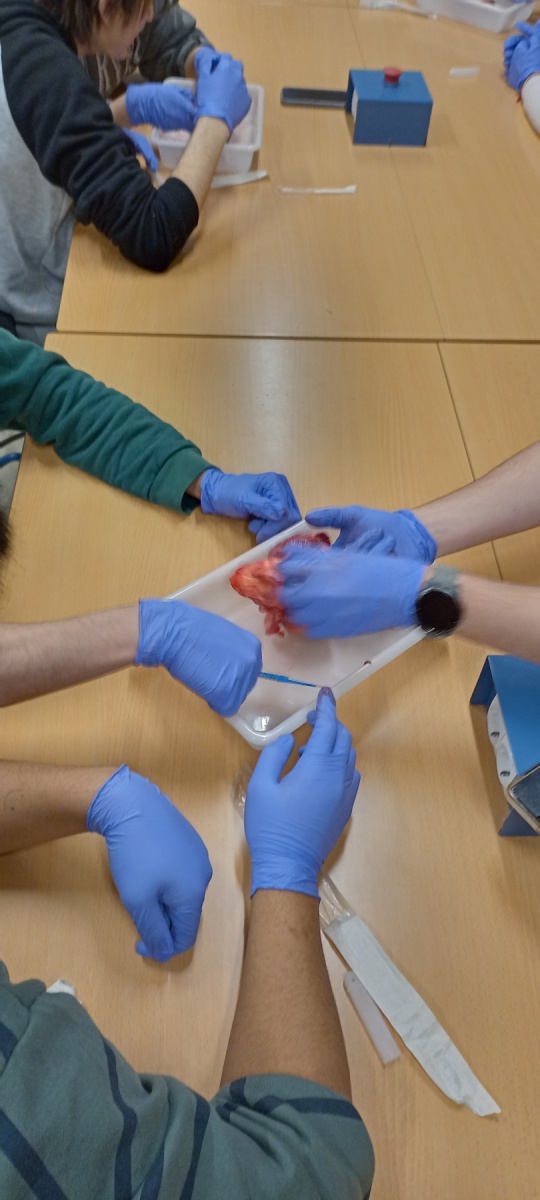 Aprovechando la festividad del día de los enamorados, San Valentín, los alumnos de 1° de bachillerato de ciencias de la salud del IES Mediterráneo diseccionando corazones.