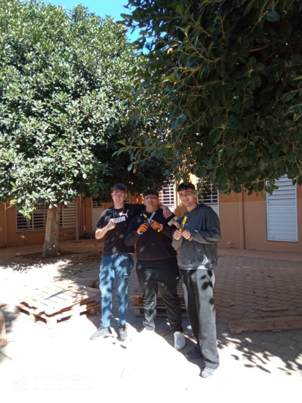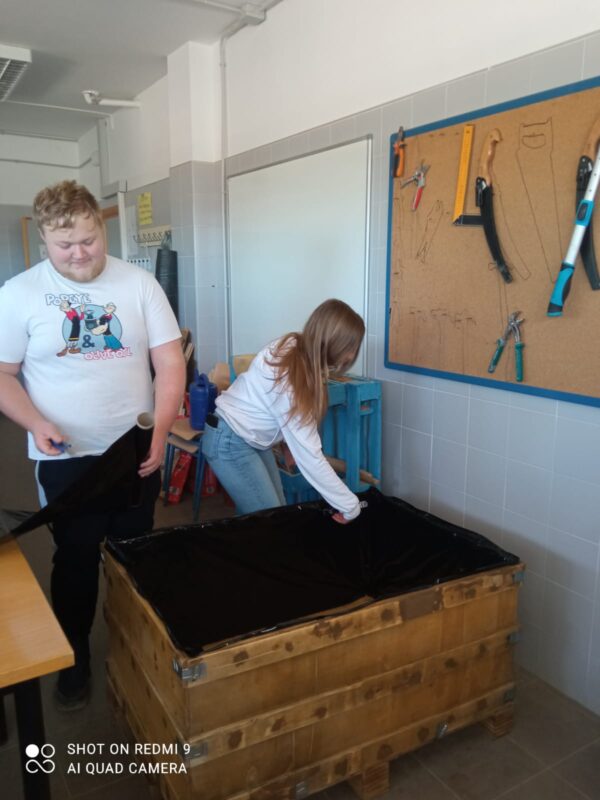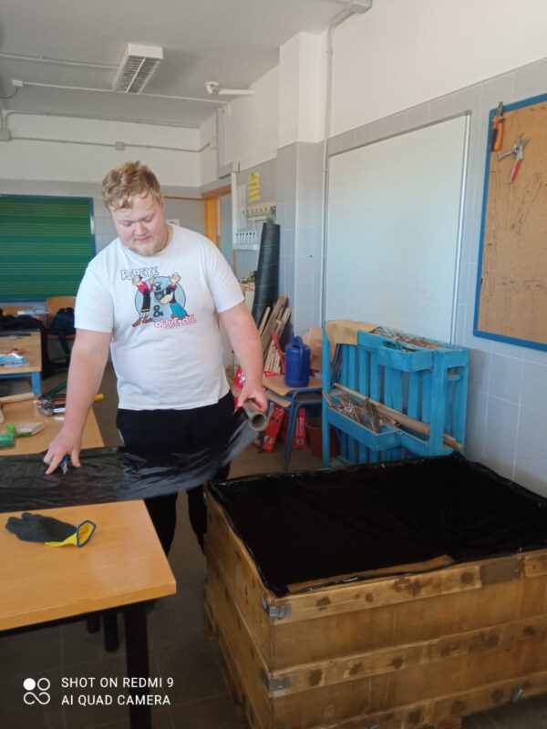 Además, también han estado forrando nuestro macetero para posterior plantación, haciendo sus maravillas con las maderas, y no podemos olvidar de nuestro jardín vertical que lo están preparando con mucho cariño. 🌸🌿🪵✨